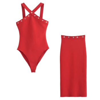 Conjunto de falda midi de cintura media para mujer, mono ajustado elástico con cuello Halter y hombros descubiertos, ojal de Metal ajustado para verano