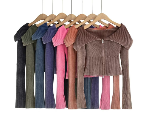 Abrigo degradado de punto plano fino 2023, cárdigan marinero con cremallera y solapa grande con mangas acampanadas, suéter corto de invierno con logotipo frontal