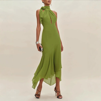 Para Amazon, sitio web independiente transfronterizo, vestido largo ajustado para mujer, estilo europeo americano, diseño de volantes sin espalda, sólido
